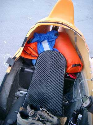 The picture below shows the velomobile loaded with some camping gear. Just add another clothes bag, stove and a food bag and we are ready for a longer trip. Suprising the velomobile performed very much lilke when it was empty even with the gear in it. It just felt a bit heavier. Most of the weight ends up close to the rear axle as that is where the most volume is. If I added a bag or two under the seat the weight distribution would be very close to what its like empty. There is still room to strap a couple of bags beside the heel cutouts if you wanted to fine tune the balance.